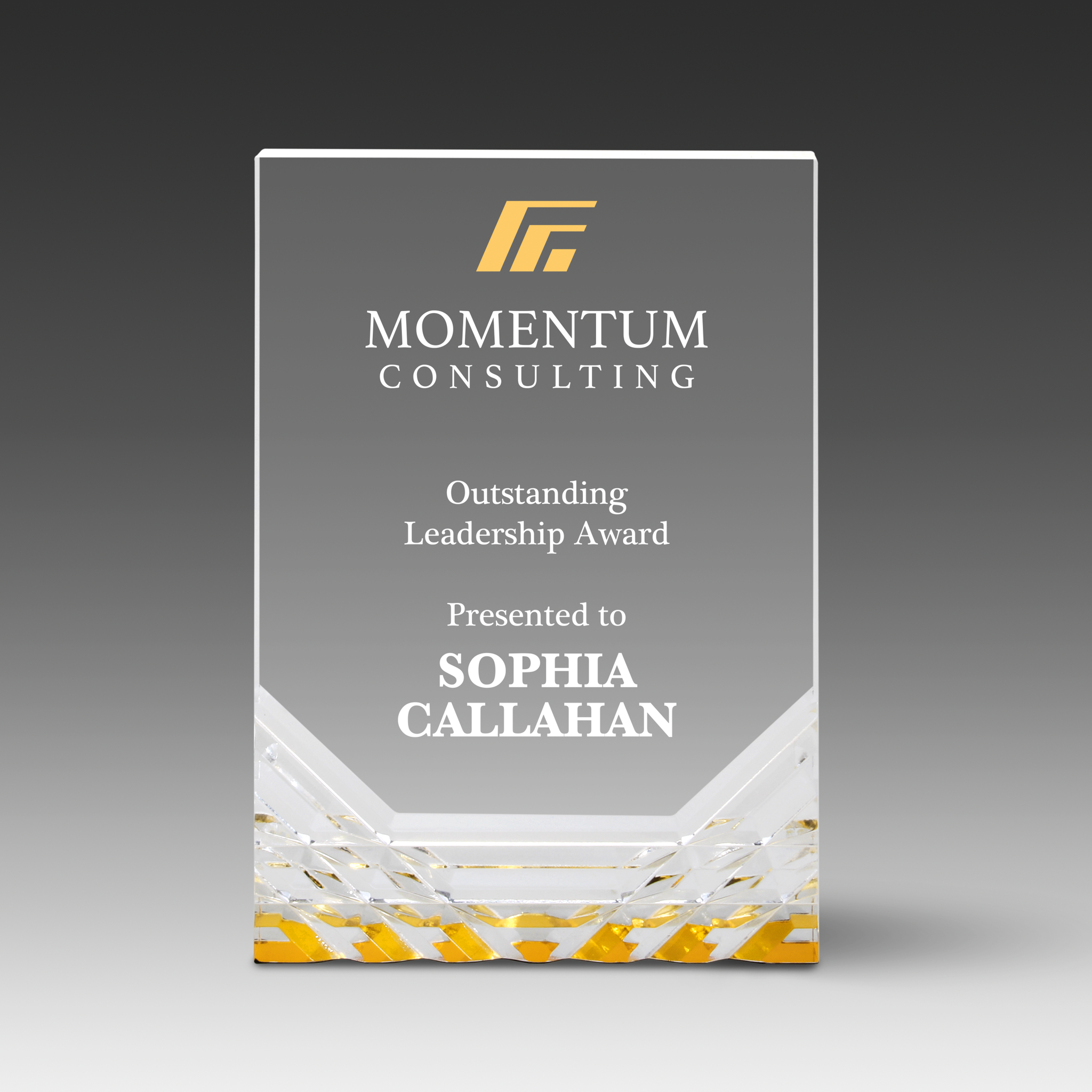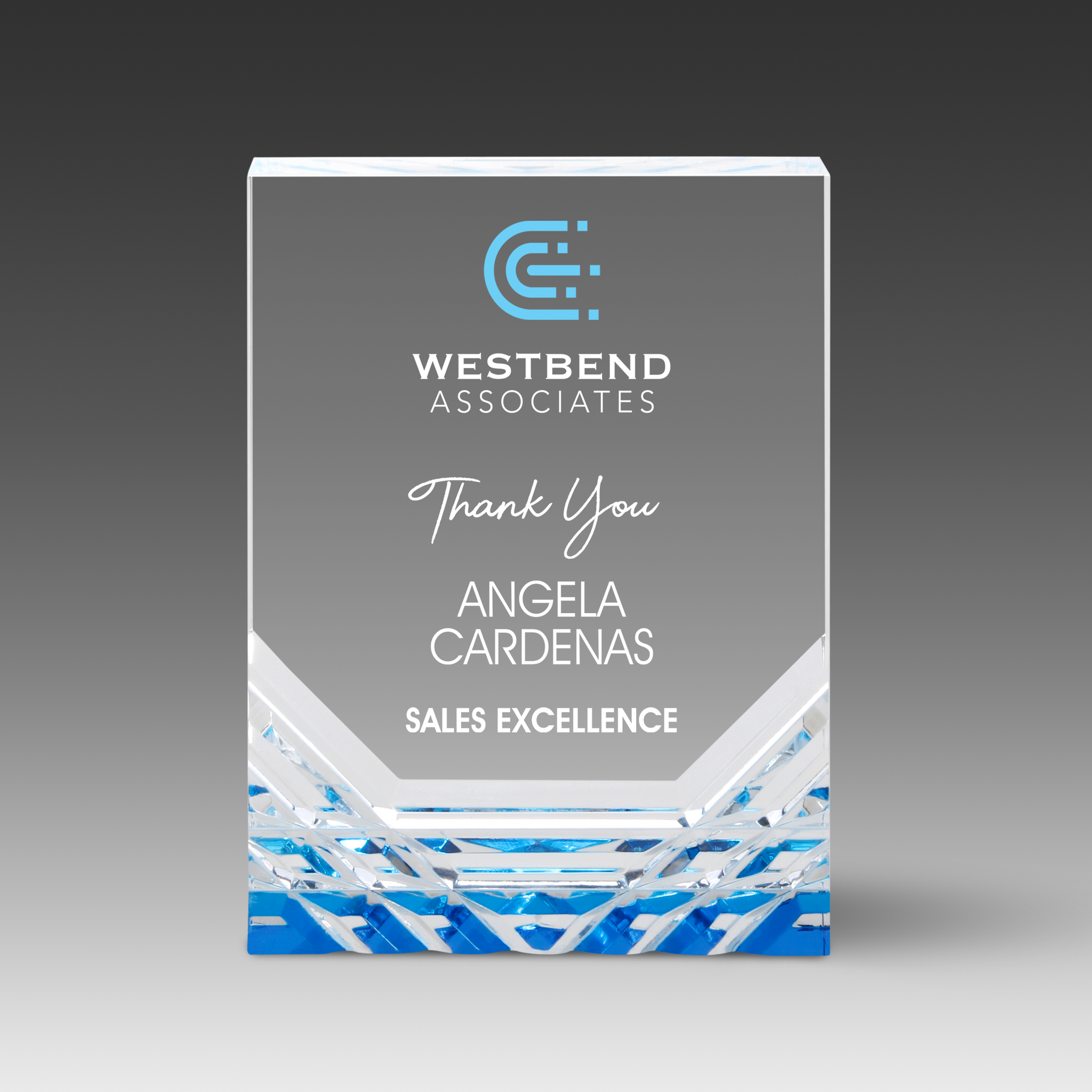 Introducing Virelli Awards — our premium line crafted for distributors who want quality, value and easy selling. Each award features a 1" thick freestanding design, radiant diamond-cut grooves and your choice of clear or blue and gold reflective bottoms to match any recognition style. Enjoy Versatile Print™ customization with full-color, UV spot or laser engraving and choose from three available sizes. All dimensions approximate.